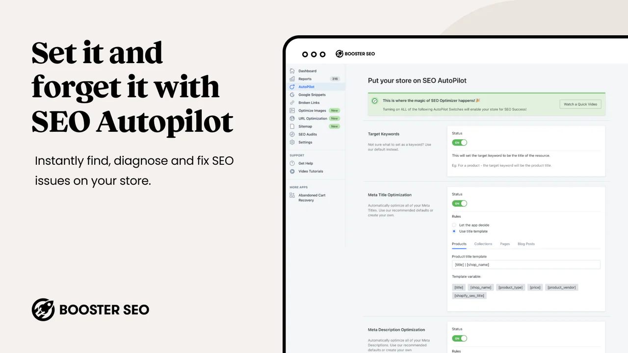 SEO Booster is an app designed to help you optimize your Shopify store’s on-page SEO. It automatically scans your website for SEO issues, such as missing alt texts or meta descriptions, and offers suggestions to improve your rankings on search engines.